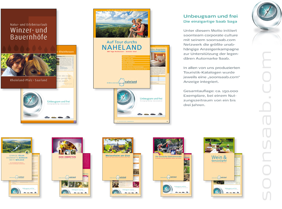 In allen von uns produzierten Touristik-Katalogen wurde jeweils eine „soonsaab.com“ Anzeige integriert. Gesamtauflage: ca. 150.000 Exemplare, bei einem Nutzungszeitraum von ein bis drei Jahren. Die hochwertigen Publikationen enthalten sonst keinerlei branchenfremde Anzeigen.